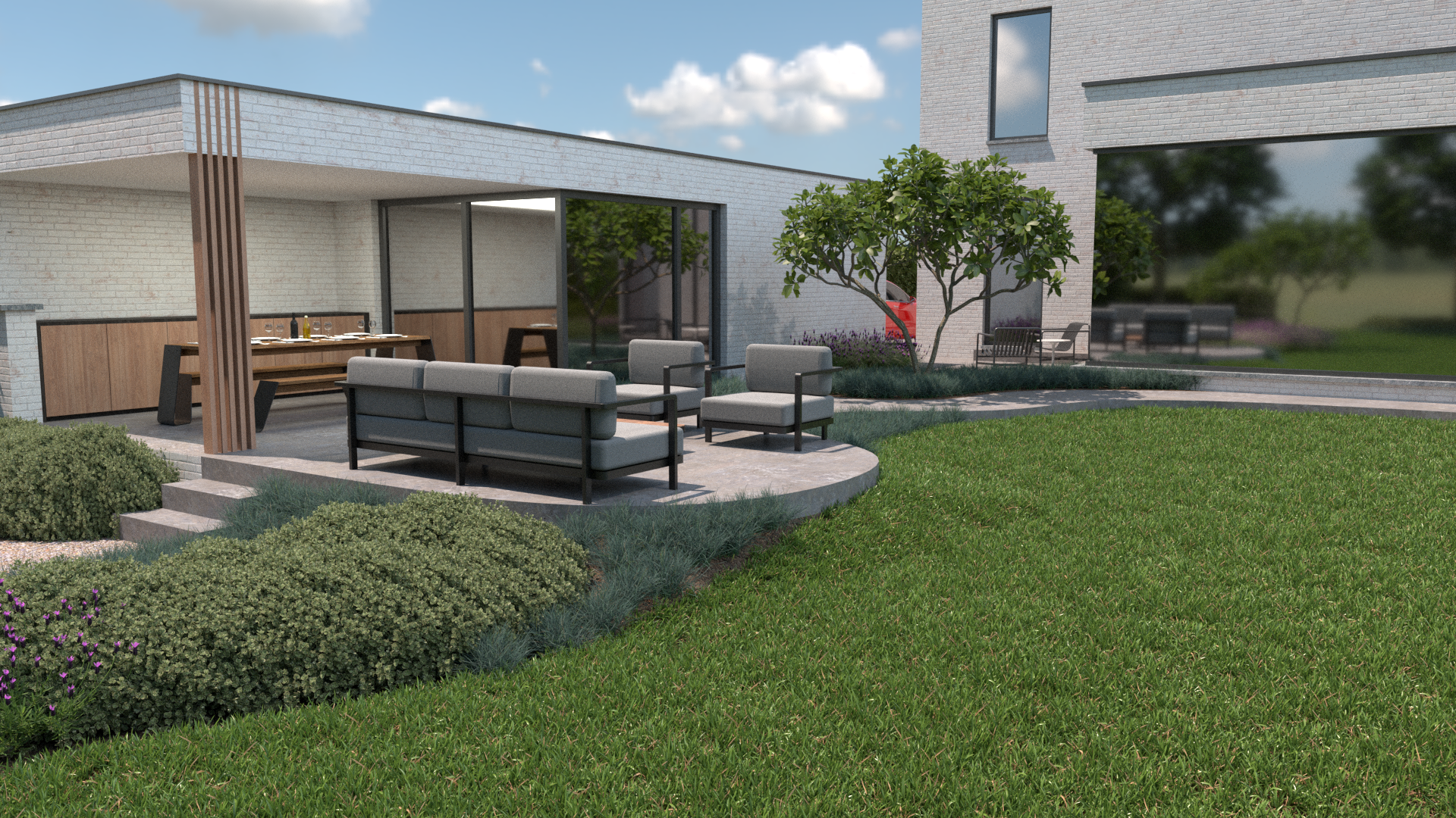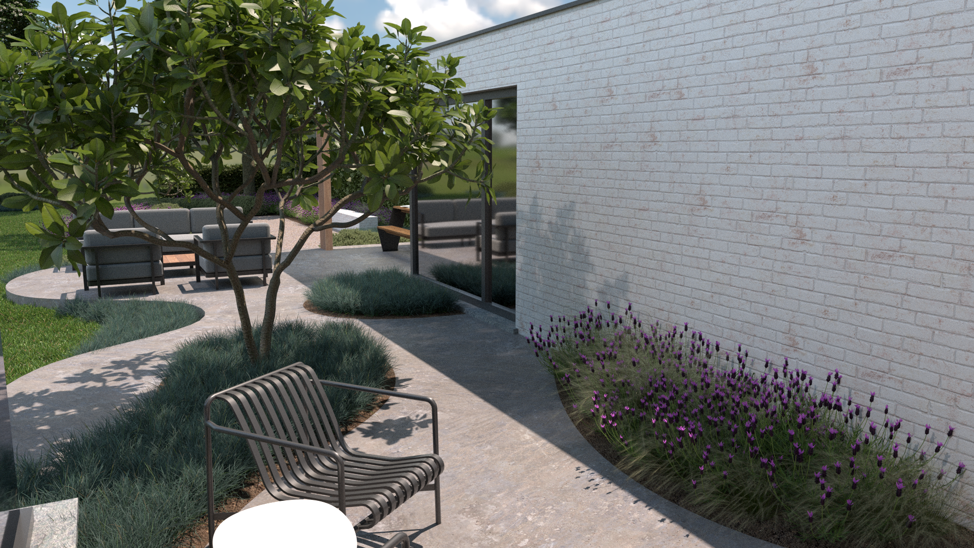 De tuin is ontworpen met meerdere zithoeken: een overdekt terras en een uitnodigende loungeplek om elk seizoen volop van het buitenleven te genieten. Strategisch geplaatste bomen en bloeiende borders bieden privacy, schaduw en kleur doorheen het jaar.