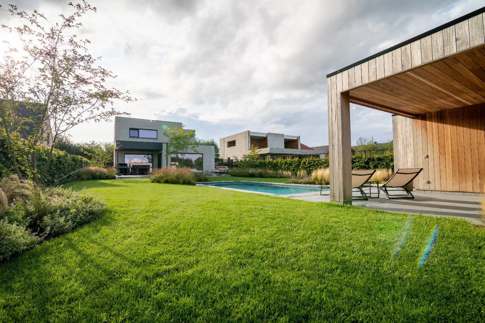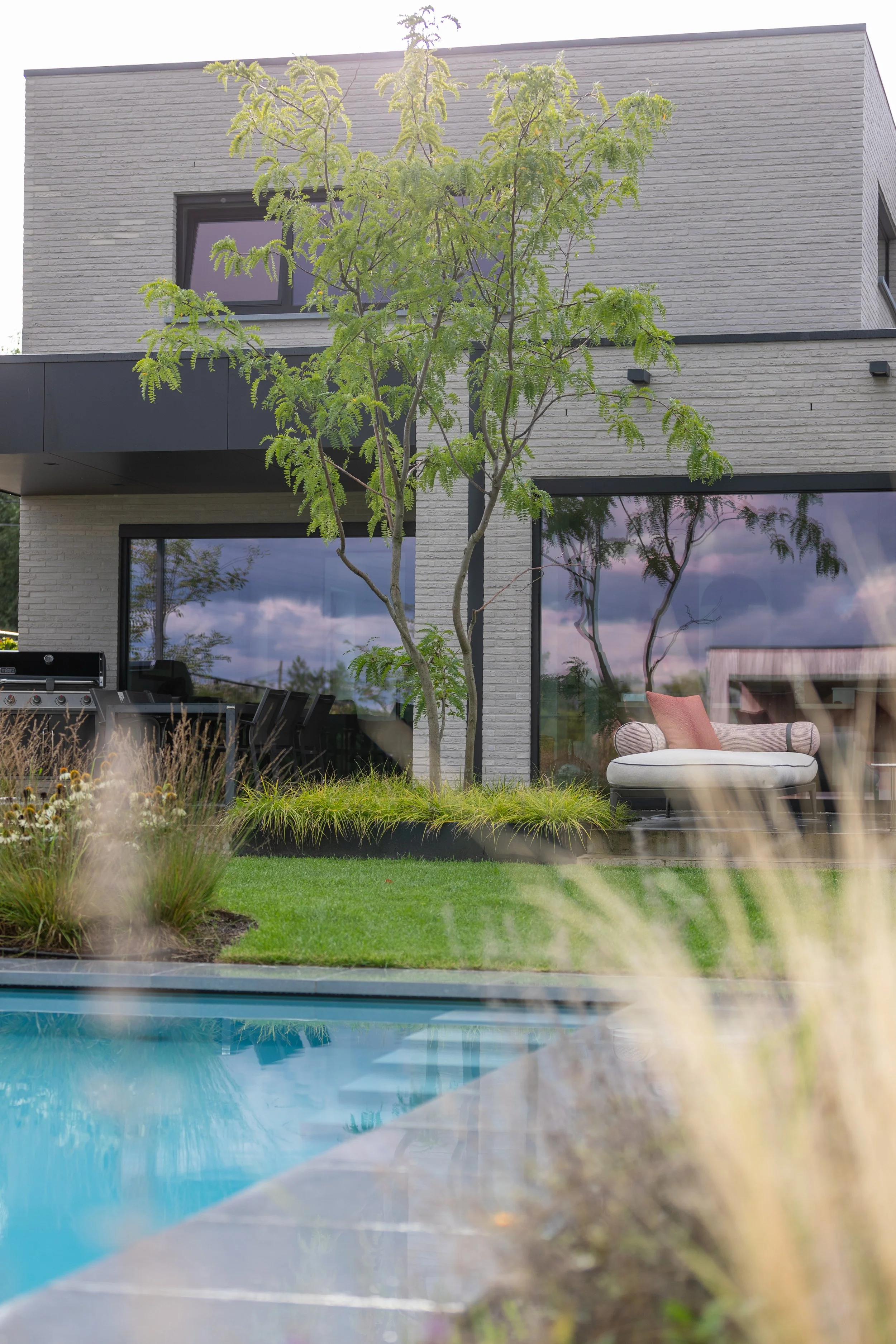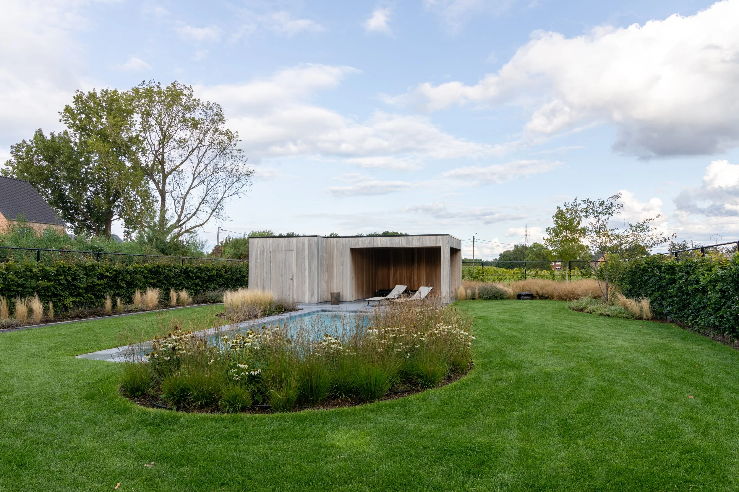Deze tuin in Putte toont de perfecte mix tussen een moderne woning en een organisch tuinontwerp. Strakke lijnen en hedendaagse architectuur worden in balans gebracht met siergrassen, hagen en bomen die zorgen voor een natuurlijke uitstraling. Het zwembad en het moderne poolhouse zijn blikvangers die naadloos aansluiten bij de groene omgeving.